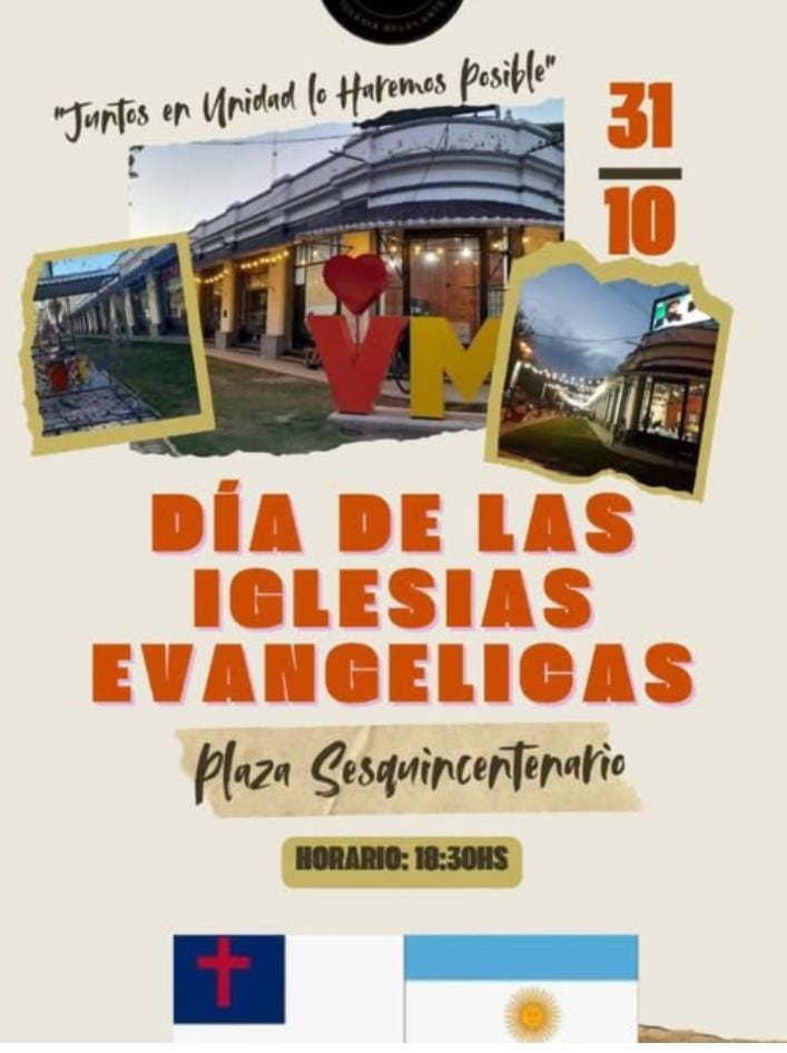 El próximo viernes 31 de octubre, la ciudad de Villa Mercedes, San Luis, será escenario de un acto central por el Día de las Iglesias Evangélicas, bajo el lema: “Juntos en Unidad lo Haremos Posible”. El encuentro se desarrollará en la Plaza Sesquicentenario, a partir Hs 10:30 , y reunirá a distintas congregaciones locales en una jornada de fe, unidad y reflexión. Desde la organización destacaron que la celebración busca fortalecer los lazos entre las iglesias evangélicas y la comunidad, compartiendo un mensaje de esperanza y compromiso cristiano.