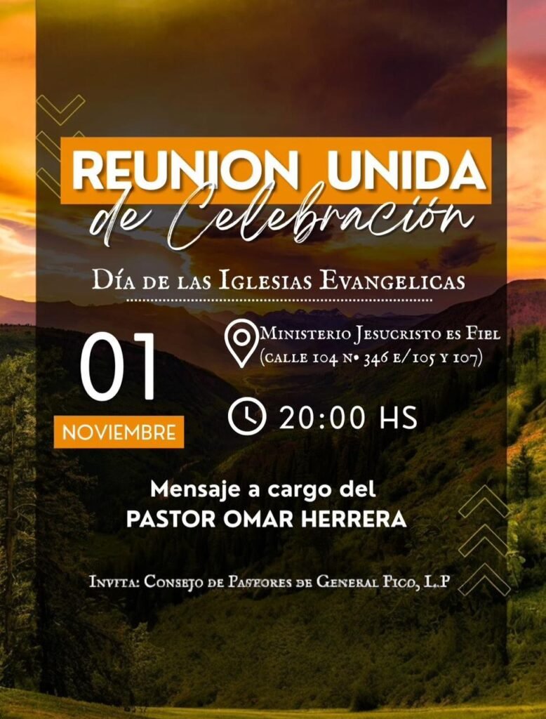 La ciudad de General Pico será escenario de una Reunión Unida de Celebración organizada por el Consejo Pastoral de General Pico, que tendrá lugar este viernes a las 20 horas en el Ministerio Jesucristo es Fiel.