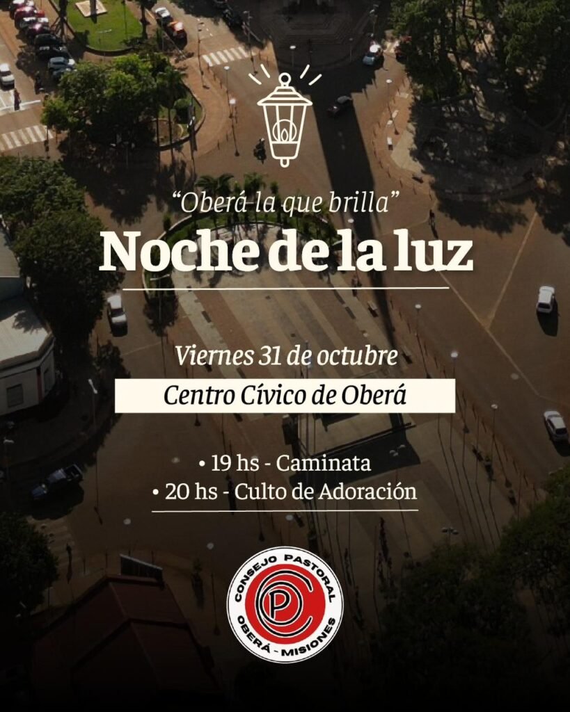 Este viernes 31 de octubre, la ciudad de Oberá será escenario de una jornada especial bajo el lema “Oberá, la que brilla”, una propuesta que busca promover la fe, la esperanza y la unidad de la comunidad. La actividad, organizada por el Consejo Pastoral de Oberá (Misiones), se desarrollará en el Centro Cívico y contará con dos momentos centrales: a Hs 19 se realizará la Caminata de la Luz, mientras que a Hs 20 tendrá lugar un culto de adoración abierto a toda la ciudadanía para compartir una noche de celebración y reflexión, iluminando la ciudad con un mensaje de paz y amor.