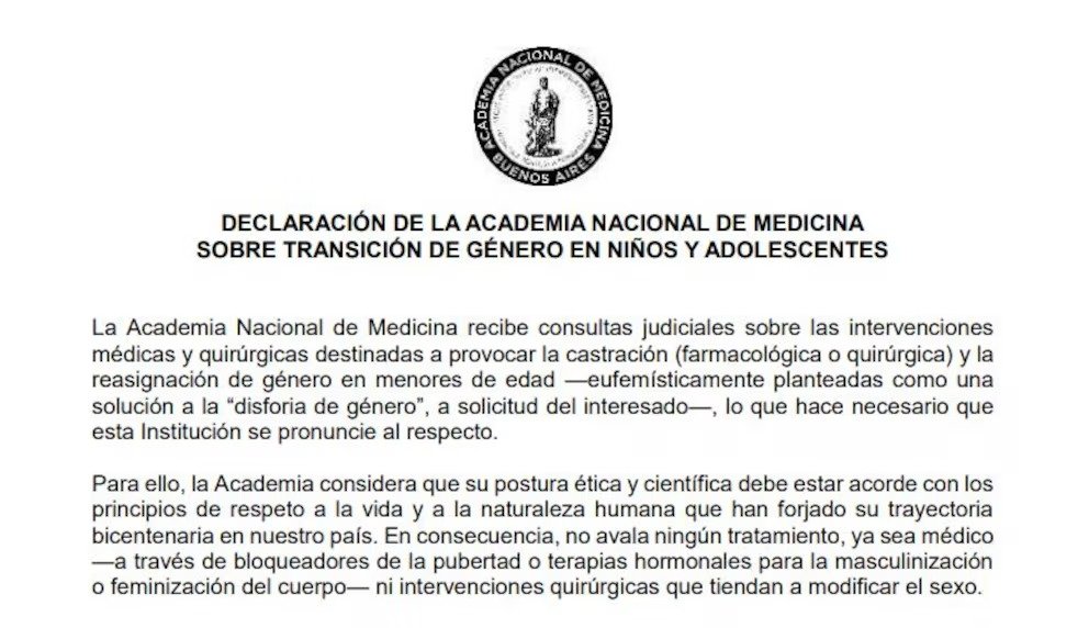 La Academia Nacional de Medicina de Buenos Aires difundió una declaración oficial en la que fija una posición categórica respecto a los tratamientos de transición de género aplicados a niños y adolescentes, advirtiendo sobre sus efectos irreversibles y su falta de sustento científico.