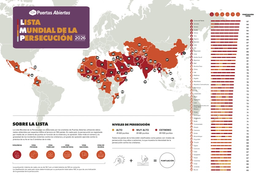 La Lista Mundial de la Persecución 2026 se basa en un análisis exhaustivo de la presión y la violencia en distintos ámbitos de la vida cotidiana, y constituye uno de los principales indicadores internacionales sobre la situación de los cristianos perseguidos en el mundo.